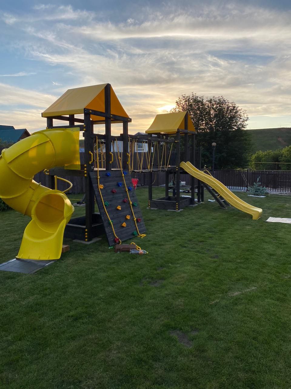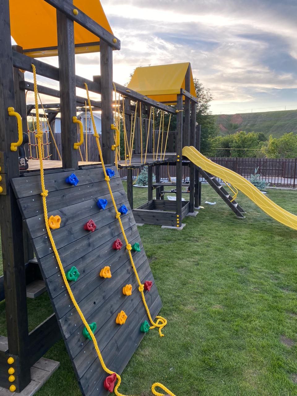 Обращаем Ваше внимание, что фактический цвет детской площадки может отличаться от представленных фото на сайте. Специфика окраски нетоксичными пропитками и красителями допускает отклонения в цветовой гамме отгружаемых изделий. Также обратите внимание, что фактический цвет может отличаться из-за цветопередачи устройства на котором Вы смотрите фото.