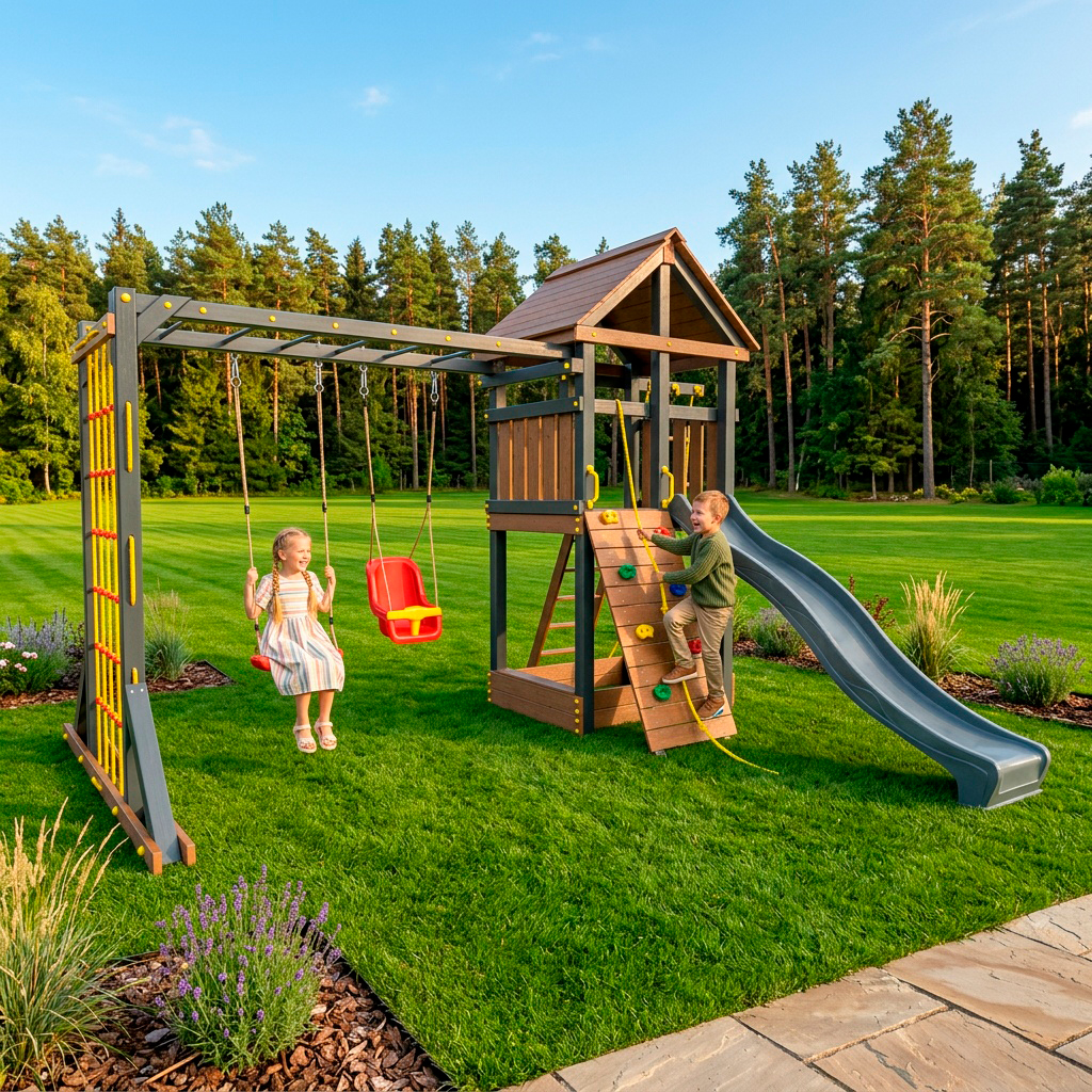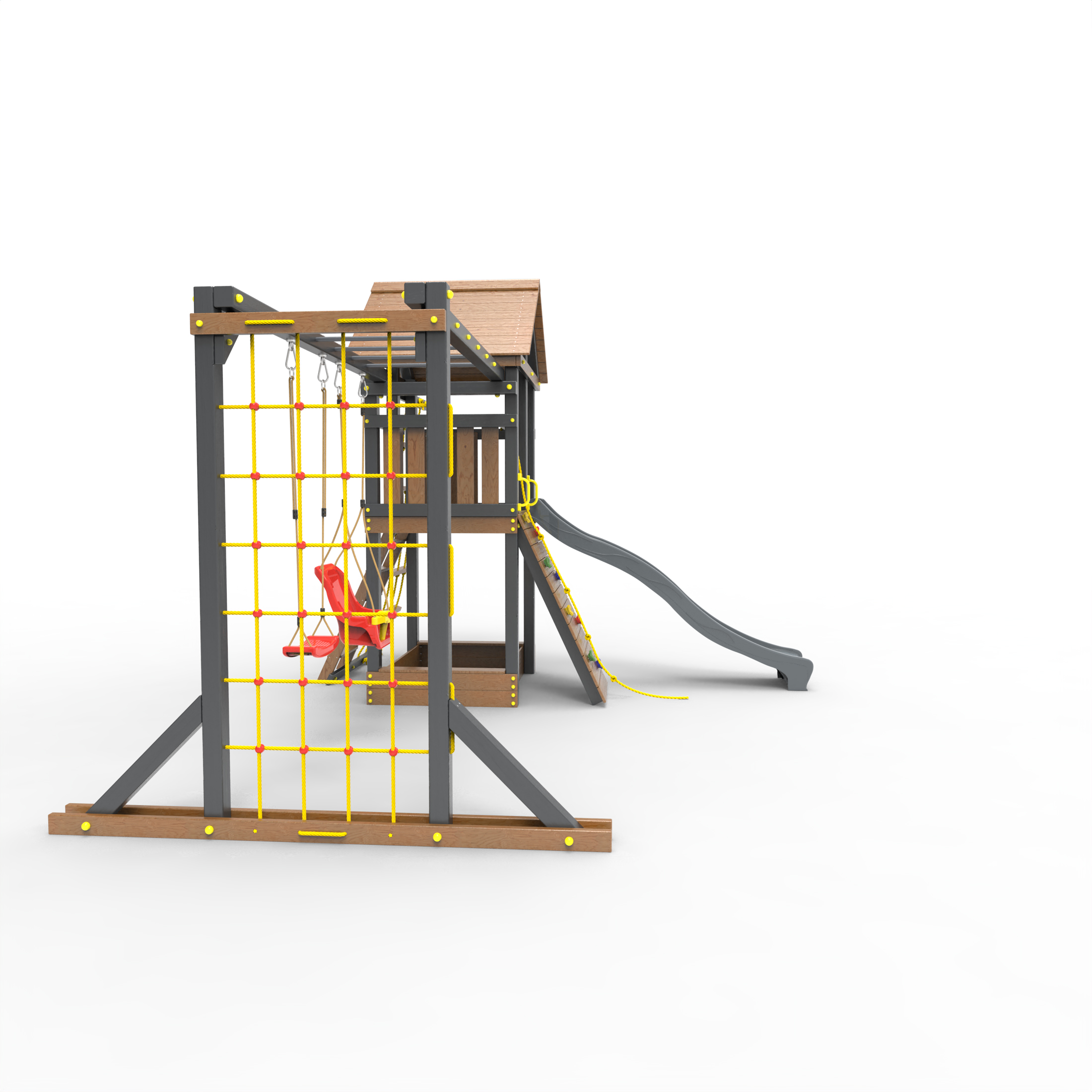 Обращаем Ваше внимание, что фактический цвет детской площадки может отличаться от представленных фото на сайте. Специфика окраски нетоксичными пропитками и красителями допускает отклонения в цветовой гамме отгружаемых изделий. Также обратите внимание, что фактический цвет может отличаться из-за цветопередачи устройства на котором Вы смотрите фото. Производитель оставляет за собой право менять цвет отдельных деталей и комплектующих(включая пластик, канаты и пр.), при этом сохраняя весь функционал и характеристики товара.